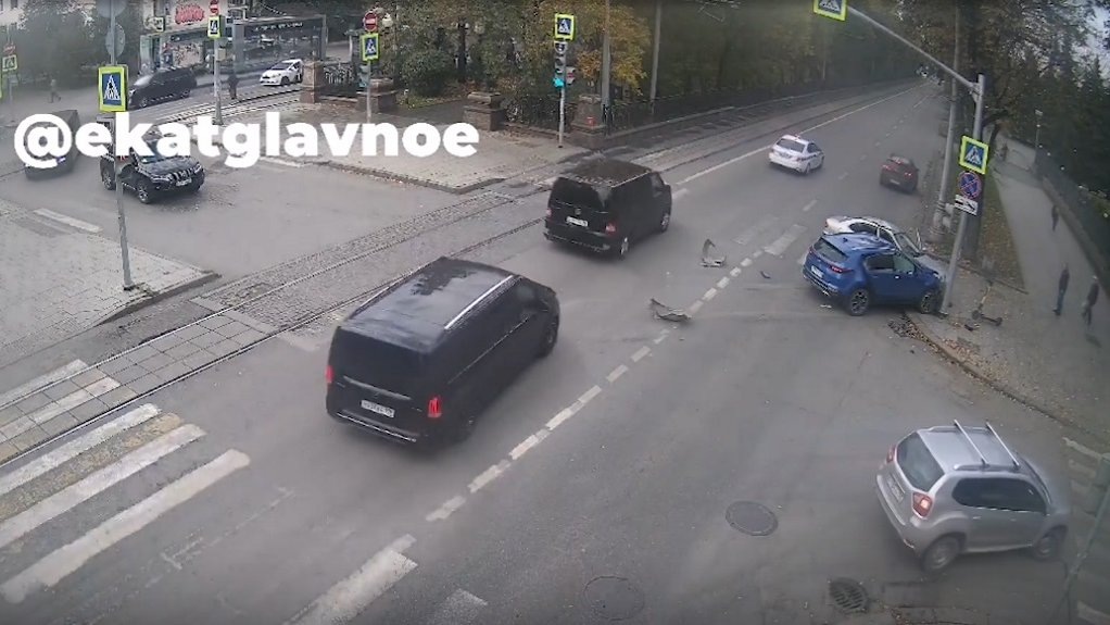 В Екатеринбурге произошло серьезное ДТП на проспекте Ленина: из-за серого седана, который не уступил дорогу синему автомобилю (тот ехал прямо и на зеленый), случилось столкновение. Машины отбросило в сторону тротуара, к счастью, стоявшие там люди не пострадали и успели отпрыгнуть.