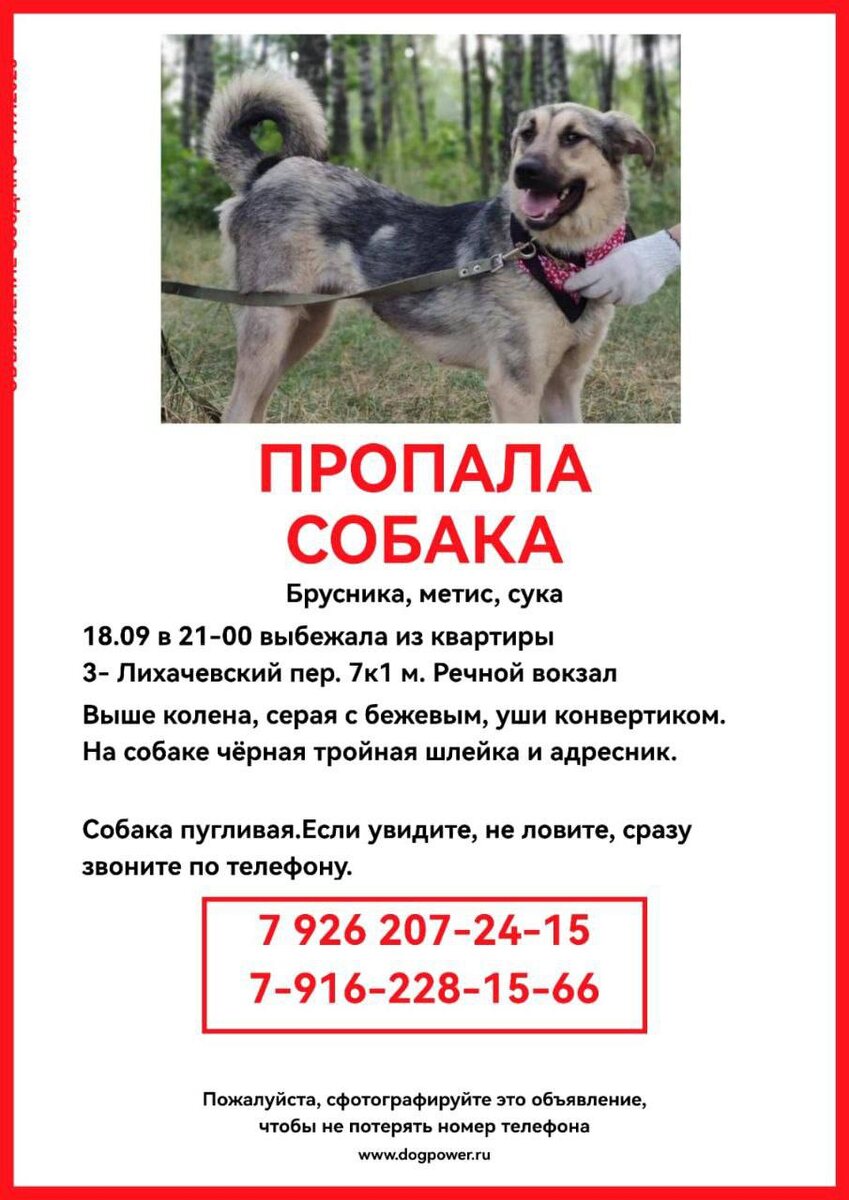 ‼️ПОМОГАЕМ ИНФОРМАЦИОННО 🚨 ⚠️ Пропала собака 📍 Г. Москва, Головинский район, метро Речной вокзал, 3-Лихачевский переулок 7к1 18.09 в 21-00 выбежала из квартиры Собака выше колена, метис, сука. Окрас серая с бежевым. На собаке чёрная тройная шлейка и адресник с номером телефона. Пугливая, не ловить. По возможности сфотографировать и позвонить по телефону в любое время 👤️ +7 926 207-24-15 Александра Чат поиска ➡️ https://t.me/brusni4kaboo1