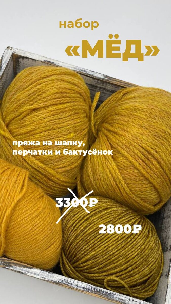 Секретный набор пряжи «МЁД» 🍯 🤩Мериносовый шнурок на шапочку с отворотом 🤩Нежная альпака на перчатки 🤩Меланжевый меринос на бактусёнок Общий вес набора: 200г 💛При покупке набора описание бактусёнка В ПОДАРОК Стоимость набора: 3300₽ 2800₽ Забронировать набор: @initki_shop_bot