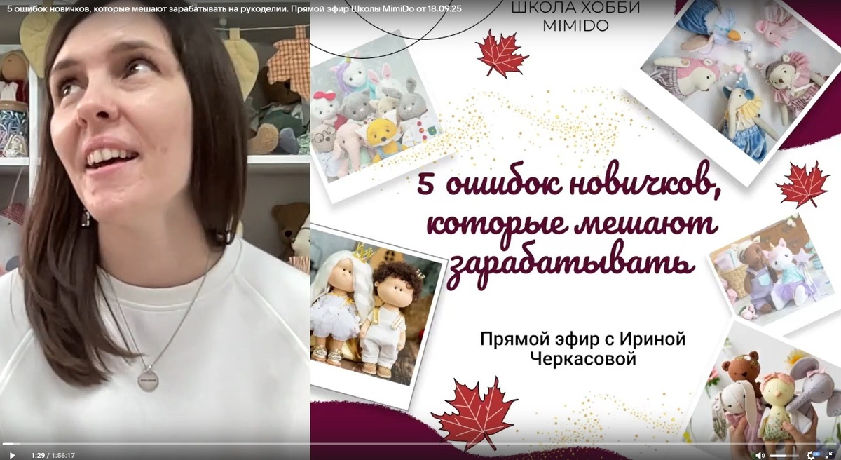 🔝 5 ошибок, которые мешают зарабатывать на рукоделии Прямой эфир с Ириной Черкасовой, Школа MimiDo. Запись от 18.09.25 👋 Девочки, кто не смог попасть на прямой эфир вчера - можно посмотреть запись сейчас! Полезно будет и тем, кто уже шьёт и продаёт игрушки – свежий взгляд не помешает. А если вы только открыли для себя мир создания текстильных игрушек – для вас дополнительная мотивация. Хобби может приносить деньги! 📌 Ссылочки прикрепляю Запись эфира можно посмотреть на нашей страничке в ВК: 👉 https://vkvideo.ru/video-48615229_456250352 Подать заявку на Стипендию - здесь: 👉 https://mimido.su/sttgk Записаться в Клуб Донат можно здесь: 👉 http://vk.com/donut/mir_tilda