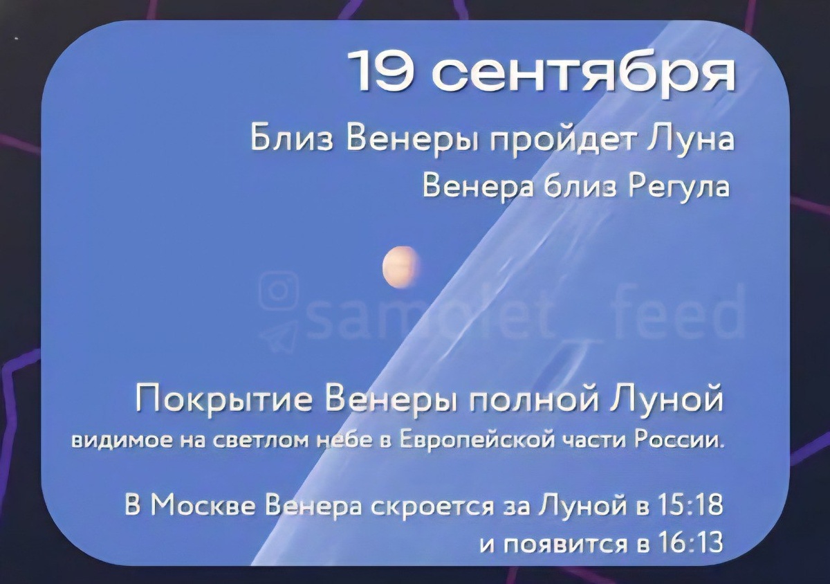Сегодня жители центральной части России смогут увидеть редкое астрономическое явление — затмение Венеры. 19 сентября, по данным Московского планетария, в 15:18 Венера скроется за Луной и снова появится на светлом небе в 16:13. ________ Присылать новость @mstislavz 👉 Обсудить в чате ЖК 👉 Подписаться на канал