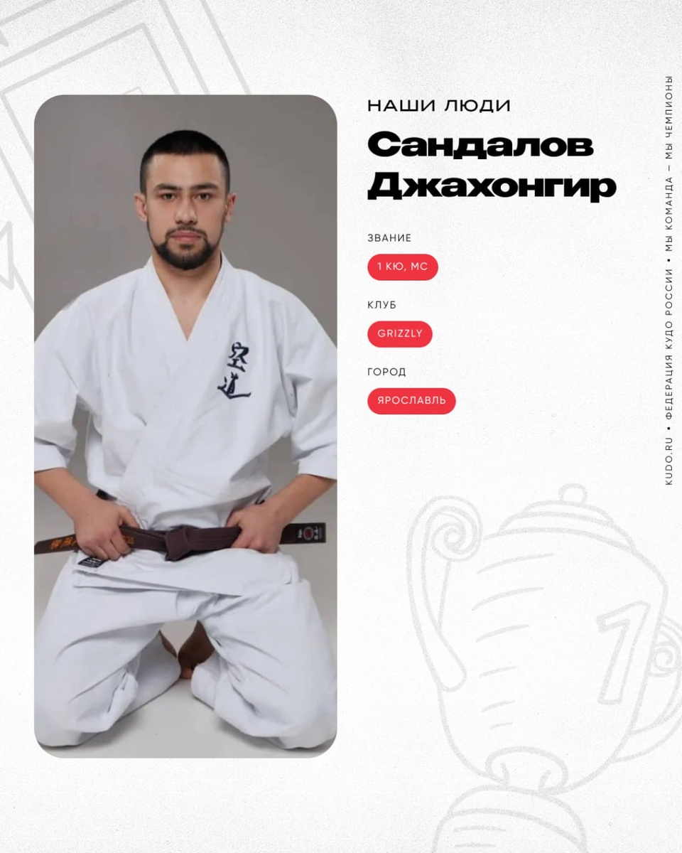 #НашиЛюди ⠀ 🥋 Сандалов Джахонгир — 1 кю, МС Чемпион Кубка России, трёхкратный серебряный призёр Чемпионата России, серебряным призёр Кубка России. Любит драйв, эмоции, адреналин. Ценит кудо за максимальную приближенность к жизни. Стремится стать лучшей версией самого себя. ⛩ Спортивный клуб — GRIZZLY 📍 Город проживания — г. Ярославль Джахонгиру Сандалову 22 года, он родился и вырос в Ярославской области, в уютном городе Рыбинске, знаменитом своими необычными рекламными вывесками и живописными пейзажами. Джахонгир получает высшее педагогическое образование, совмещает заочное обучение с тренировками и работой. Он рассказывает, что в спорт пришёл в раннем возрасте — целых 16 лет назад. Сначала занимался футболом, но быстро выяснилось, что футболист он никудышный. «Мяч меня интересовал меньше, чем соперники. Вместо пасов, подкатов и голов — конфликты. Я дрался, когда надо было забивать, и дрался, когда забивал кто-то другой. Тренер был в шоке», — смеётся, вспоминая то время, Джах