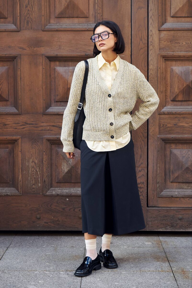 Casual образ от стилиста Kristina&Milan ✨ Первым слоем идет базовая лимонная рубашка, которая выглядывает из-под объёмного меланжевого кардигана в тонкую полоску и добавляет светлый акцент в портретную зону, а фактура вязки делает образ более уютным. Костюмные брюки кюлоты со свободным кроем создают ощущение лёгкости и визуально напоминают юбку. Завершаем образ аксессуарами: имиджевые очки, кожаный шопер и главный акцент– глянцевые пенни-лоферы из натуральной лакированной кожи. Их мы стилизовали с молочными полупрозрачными носками (любимый приём, который отсылает к студенческой эстетике) В итоге получаем стильный аутфит как для тех, кто учится, так и для повседневных выходов: от прогулки по городу до встречи в кафе. А куда отправились бы вы в этом образе?
