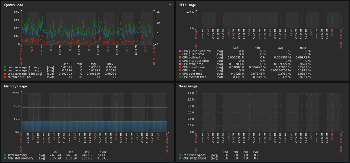 При этом наши специалисты могут установить и множество других систем мониторинга, включая Nagios, Prometeus (PGL), Elasticsearch (ELK, EFK), Munin и Monitorix.
