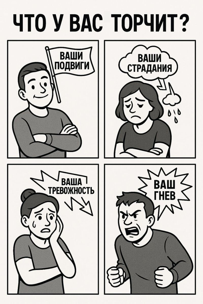 Это - то, за что часто цепляетесь вы сами или другие люди. Что не так, как у других. Что вам приходится часто как-то обрабатывать. Что вызывает разные эмоции у вас или людей. То, о чем вам часто говорят, или вы сами часто говорите. То, что вы защищаете или по поводу чего оправдываетесь. Противоречия, перекосы, странности, уязвимости. - Ваши подвиги? Ваша крутизна? То, что все остальные вам в подметки не годятся и все делают не так? - Ваши страдания? Ваша особенно сложная жизнь? Ваши стоны и нагнетания? - Ваша тревожность, переполненность страхами тут и там? Страхи по поводу простых вещей, которые все делают? - Ваша обидчивость? Ваши переживания, кто что сказал? То, что все люди делают все не так, как вы считаете? - Ваш регулярный гнев, возмущение, конфликты и споры? - Ваши какие-то противоречия? Вы то ноете, то хвастаетесь? То прибедняетесь, то "сияете"? То круче всех, то хуже всех? - Непонятная вам регулярная агрессия со стороны других людей? - Ваши проблемы со здоровьем? С работо