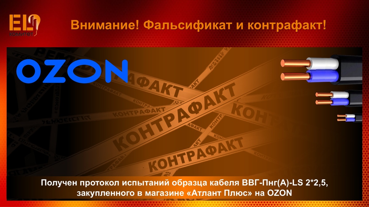 EL-Комитетом НОПСМ получен протокол испытаний образца кабеля ВВГ-Пнг(А)-LS 2*2,5 с маркировкой на оболочке «ТКЗ». Данный образец был закуплен в магазине «Атлант Плюс» на площадке ОЗОН. ❌ По результатам технических испытаний отобранного образца кабеля были выявлены отклонения до 8 % по показателю «электрическое сопротивление токопроводящих жил» (п.п. 5.2.2.1 ГОСТ 31996-2012). Напомним, в июле 2025 г. на нашем канале были опубликованы результаты испытаний другого образца (ВВГ-Пнг(А)-LS 3*1,5) данной «торговой марки», которые также свидетельствуют о существенных отклонениях от требований ГОСТ. ➡️ Отметим, что данная продукция является не только фальсификатом, но и контрафактом: после нашей прошлой публикации к нам поступили официальные обращения от ООО «Тольяттинский кабельный завод» и ООО «Таганрогский Кабельный Завод Энерго», в которых аргументированно сообщается, что данные производители к закупленной на маркетплейсе ОЗОН продукции ОТНОШЕНИЯ НЕ ИМЕЮТ. ❗️ Также необходимо подчеркнуть, ч