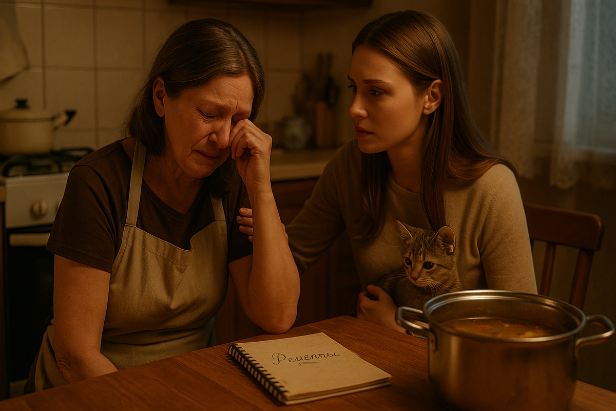 А ещё появился Семка-эффект: после его еды мы сдвигали миску — и начинался «получас без рецептов». Юля и Нина Семёновна сначала молчали, как две разные радиостанции, попавшие на одну волну. Потом стали говорить о чём-то безопасном: о том, как лучше сушить полотенца, какая музыка не мешает котёнку. Потом… как-то само собой добавились важные кусочки: про первую Юлину работу («я тогда так боялась попросить зарплату»), про первую Нинину любовь («он не любил борщ, представляете»). Тетрадь пополнялась: среди «борща» и «оладьев» возник «чай из детства» и «разговор про страхи». Я иногда заглядывала «на контроль», приносила пасту для кишечника «на всякий», ловила Семку у моих шнурков и уносила домой чувство, что где-то стало тише.