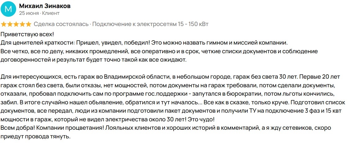 Вот так, всего за 30 дней, выполнила свои работы АО "ОРЭС - Владимирская область". Заявитель не мог подключить электричество 30 лет🫣 прочтите отзыв(фото) самого заявителя на нашу электрическую компанию ЛЭК. С нами работать легко, быстро и просто! Пример работ: 📍Местонахождение данного объекта: Владимирская область, г. Петушки. Сетевая организация: АО "ОРЭС - Владимирская область" Требуемая мощность: 15 кВт, новое подключение. Сроки на подключение: 30 рабочих дней. 🫰Экономия на подключение электричества, за счет снижения расходов на госпошлину (за кВт), составила более 130 000 руб. ☎️ Способы связи: 📞+7(911)280-02-64 Александр Оставить заявку на подключение, заключение договора или на консультацию вы можете здесь или на наших сайтах: 👉ВКонтакте - https://vk.com/lek198