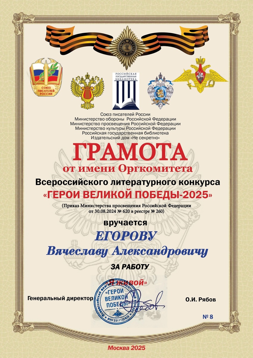 Вот такой Грамотой Оргкомитет Всероссийского литературного конкурса "ГЕРОИ ВЕЛИКОЙ ПОБЕДЫ 2025" наградил меня за стихотворение "Я живой", которое я отправлял на конкурс. В прошлом году я был в числе Победителей со стихом "Сон о бое", в этом году Финалист (лауреат) со стихом "Я живой". Скажу честно, пока ещё не решил, буду ли участвовать в следующем конкурсе, но такое признание моего творчества два года подряд очень важно для меня! Благодарю организаторов этого интересного и важного в наше время конкурса! #ВячеслааЕгоров #ГероиВеликойПобеды2025 #конкурс #стихи