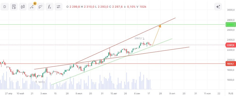 📈 ПАО «Полюс» Тикер: #PLZL Идея: Long ⬆️ Срок идеи: 3-4 недели Цель: 2707,1 руб. Потенциал идеи: 17,84% Объем входа: 8% Стоп-приказ: 1924,1 руб. 📊 Технический анализ Актив торгуется в восходящем тренде и недавно пробил уровень сопротивления, подтверждая силу покупателей. Цена закрепилась в восходящем канале, что указывает на контролируемое движение вверх. Текущие уровни поддержки и сопротивления формируют четкие границы для торговли. Объемы умеренные, но достаточные для подтверждения текущей динамики. При объеме позиции в 8% и выставлении стоп-заявки на уровне 1924,1 руб. риск на портфель составит 1,3%. Соотношение прибыль/риск составляет 1,1. ⛏ Фундаментальный фактор #Полюс — крупнейший российский производитель золота. Финпоказатели растут на фоне рекордных цен на золото. Несмотря на снижение добычи (-11%), рост цен компенсирует падение объемов. Долговая нагрузка низкая. Капзатраты выросли в 2 раза для будущего роста. Геополитическая напряженность и спрос на золото как «убежище» п