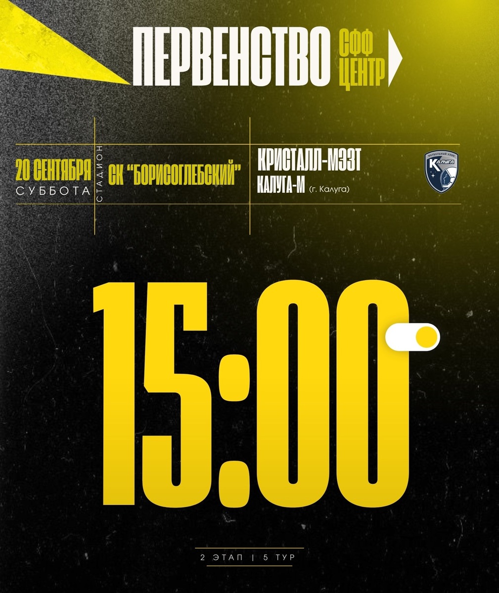 В субботу, 20 сентября в 15.00, на стадионе СК «Борисоглебский» развернется спортивная битва за лидерство в Первенстве по футболу. На поле сойдутся команды: «Кристалл-МЭЗТ» и «Калуга-М». Упорная борьба, яркие моменты и долгожданные голы уже завтра. Не пропустите!