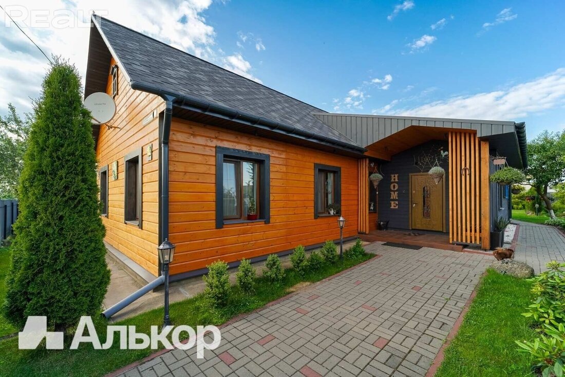 В получасе от Минска продается яркий и стильный дом, который может служить как современная дача, так и как полноценное загородное жилье. Свои «лайки» мы ему ставим за оригинальный интерьер в стиле прованс и за атмосферный антураж на участке. Вам же рекомендуем обратить внимание на ценник – коттедж этот стоит как двушка. Открываем карту и находим его месторасположение – окраина городка Червень, в 50 километрах от Минска. Добираться сюда удобно по трассе М-4. Вариант подойдет тем, кто не может представить себе жизнь вне цивилизации и городских благ в виде магазинов, кафе и учебных заведений. Сразу скажем, что это не новострой, а деревянный дом после глобальной реконструкции – под свежим фасадом прячется сруб 1956 года постройки. Снаружи он выглядит свежо – мягкая черепица на крыше, современные окна ПВХ с ламинацией, уютная терраса. Внутри тоже все по современному – ровные стены с покраской и дизайнерскими обоями, теплые полы под плиткой, ламинат, стильная сантехника в ванной комнате, пот