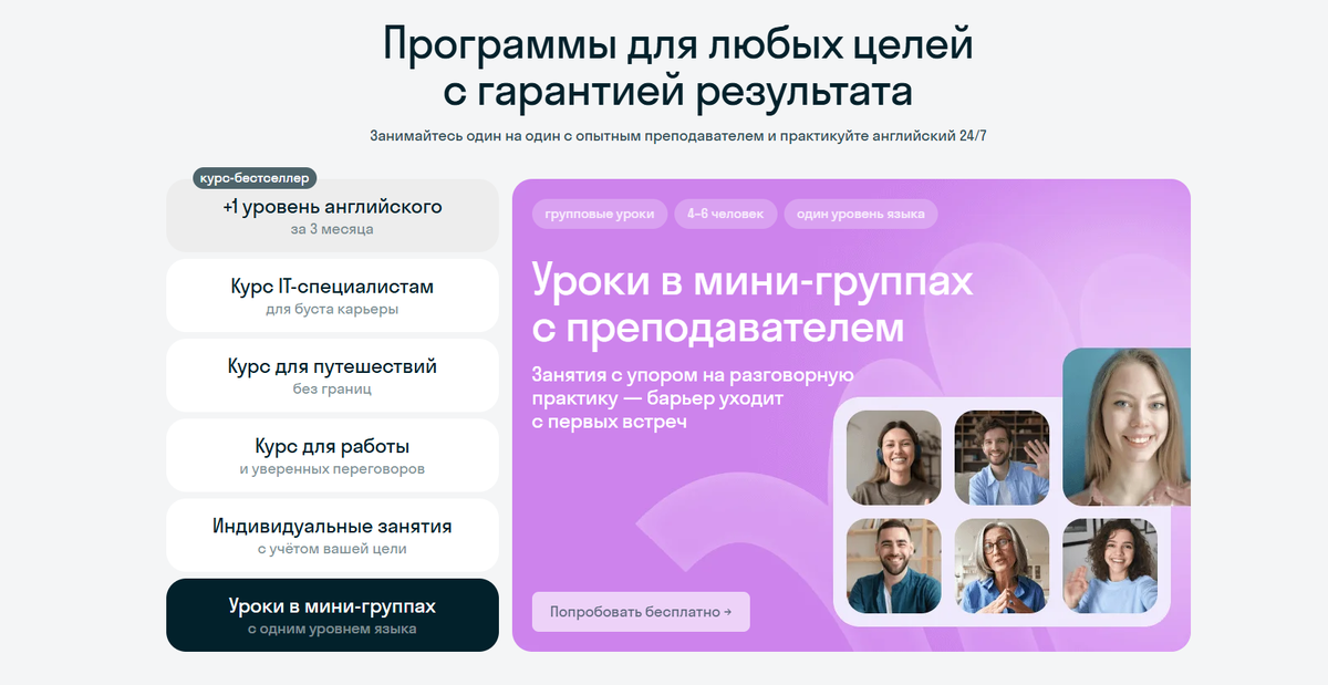 Преимущества: гибкий график, возможность выбора носителя языка, программы для всех уровней.