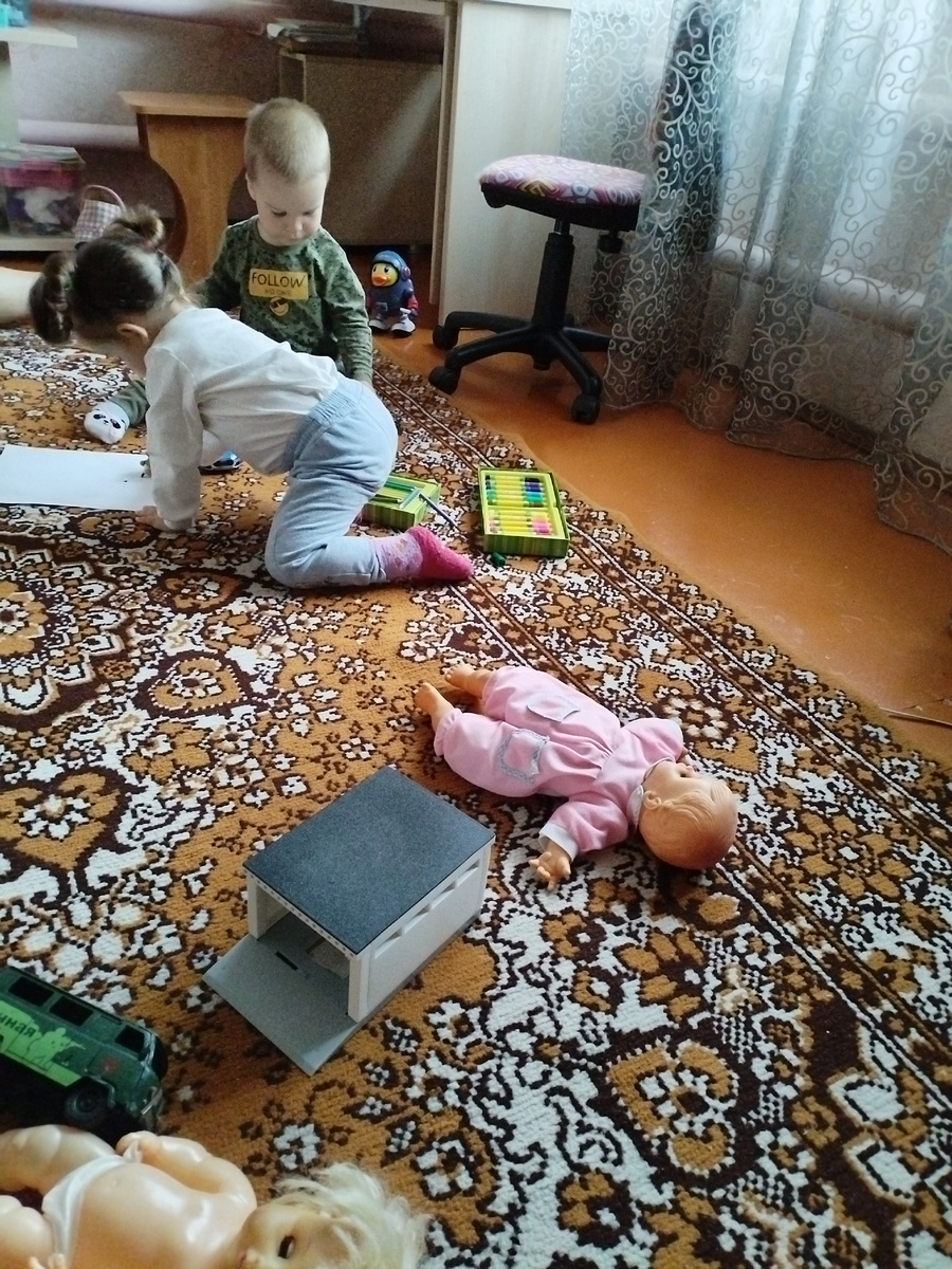 Добрый день! Мира вам, добрые люди, счастья, любви и добра! Хоть за окном и осень, а в наших душах пусть будет вечное лето, осень пусть подарит нам яркое, как она сама, счастье. Пусть осенний ветер разгонит грусть и печаль. Мы с утра у Иры в гостях. Вернее, кто в гостях, а кто работает. Дедуля наш пришёл помочь Ириному мужу крышу на времянке перекрыть, ну и мы сюда, чтоб одним дома не оставаться. У Иры малыши очень любят бывать. Только подъезжаем на машине к дому, уже издалека кричат: "Ия! Уя!" Верещат и хлопают в ладоши. Из машины бегом бегут в дом, на улице погулять не оставишь. Идут в комнату к игрушкам: "Игать". Ну хоть Амелька перестала прямой наводкой в кухню бежать и кричать: ам-ам". Игрушки стали тут раскидывать всё дальше, а плацдарм для творческих проявлений стал шире. Ира нашла внучкин сундучок с принадлежностями для творчества и принесла двойняшкам. Ну это она не подумала, что кроме бумаги будут изрисованы сами двойняшки, шкафы, игрушки, и все, что под руку попадётся. И