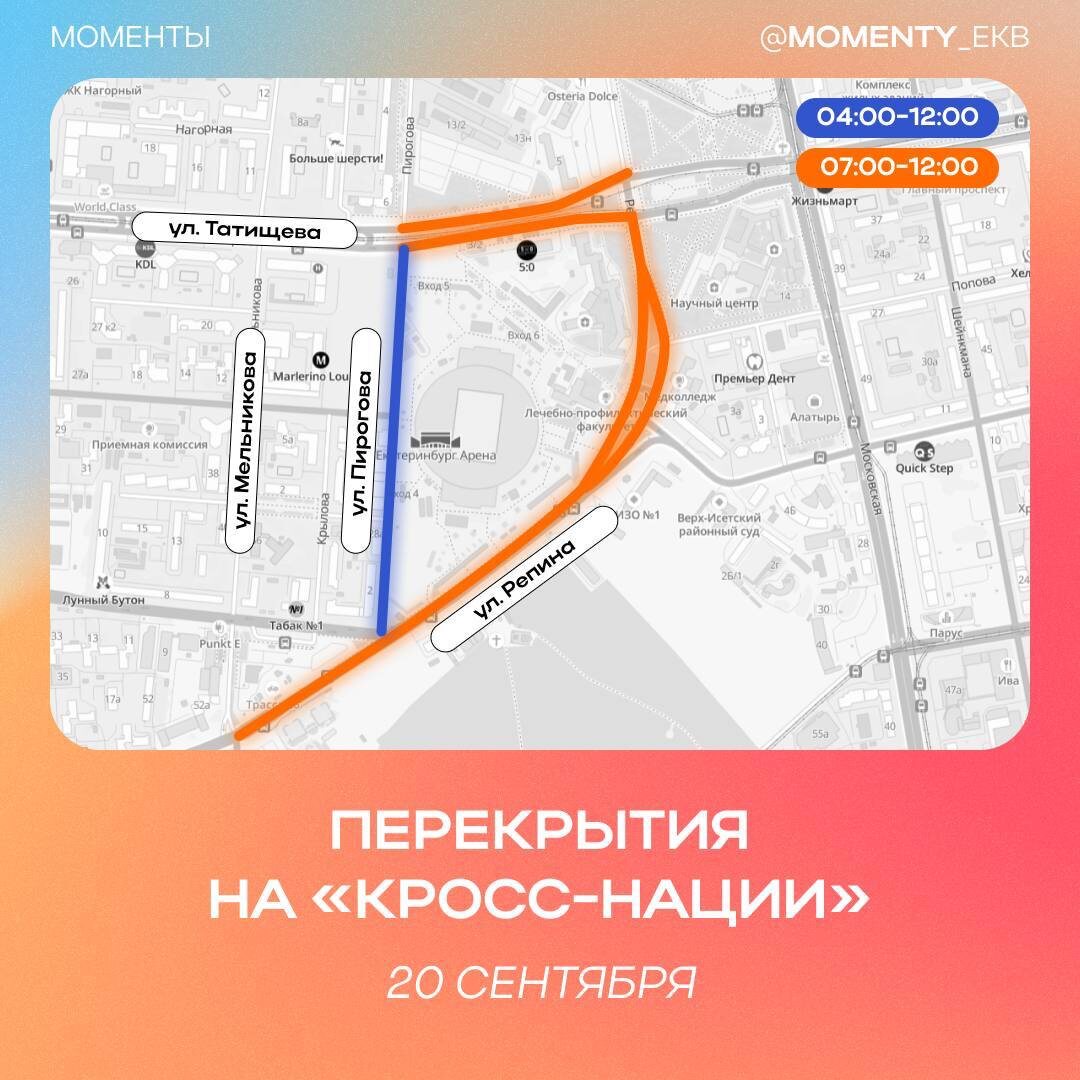 Проехать около «Екатеринбург-Арены» временно не получится. Завтра, 20 сентября, в уральской столицу стартует «Кросс нации» — ради него перекроют Пирогова, Татищева, Крауля и Репина. Также на этих участках запретят парковку. Стоянки в районе Пирогова, Ключевской, Крылова, Татищева, Крауля и Анри Барбюса будут закрыты на сутки. Помимо этого, с 7:00 утра до 12:00 введут запрет на движение СИМов, где именно — смотрите на карте. Подписаться 🔸 Обсудить