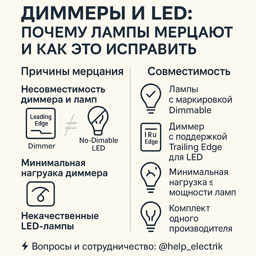 Выключили свет, а лампочки мигают? Или включили диммер — и свет то гаснет, то мерцает? Это одна из самых частых проблем, с которой сталкиваются владельцы светодиодного освещения. --- Почему LED-лампы мерцают с диммером 1. Несовместимость диммера и ламп Лампы и диммер должны поддерживать одинаковый принцип регулировки: Leading edge (передний фронт) — для старых галогенок и простых трансформаторов. Trailing edge (задний фронт) — для современных светодиодов. Если перепутать — лампы будут мерцать, гудеть или вообще не включаться. --- 2. Минимальная нагрузка диммера У большинства диммеров есть нижний порог мощности. Если подключить слишком мало ламп, они начнут моргать или не зажгутся совсем. Решение: добавить лампы или выбрать диммер с меньшим порогом. --- 3. Не качественные LED-лампы Дешёвые светодиоды имеют простой драйвер без фильтрации. Даже с правильным диммером они будут мерцать на низком уровне света. Ищите маркировку "Dimmable" на упаковке. --- Как подо