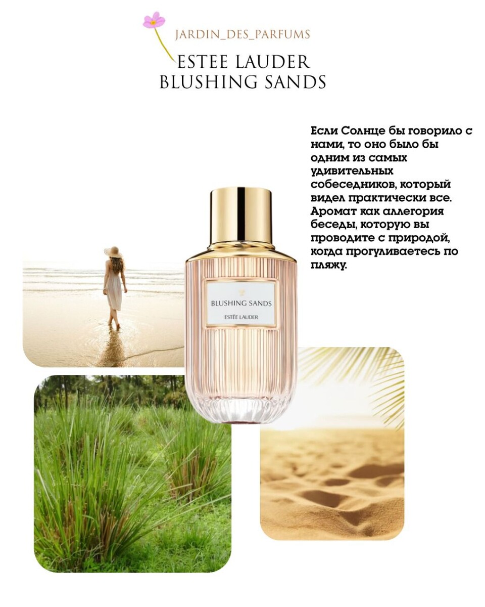 Продолжая путешествие по новинкам из осеннего сета, сегодня мы ближе познакомимся с ароматом Estee Lauder Blushing Sands, который чуть перекликается с идеей пустыни и песков, и даже минеральность прослеживается, но она деликатна и даже скрома. Официальный релиз очень живописный: "«Мечтательная, как ночь, нежная, как рассвет. Путешествие по мягким, окрашенным в розовый цвет пескам в теплый и гостеприимный мир чувств. Пышный оазис утонченной глубины, чувственности и света. Этот аромат дарит ощущение расслабления и чувственности. Мечтательный аромат гаитянского ветивера окружен мерцающей, пряной свежестью розового перца и эксклюзивным мускусным аккордом. Сочетание светлой древесины и свежих специй. Расслабленный. Чувственный. Великолепный, как окрашенный в розовый цвет пляж»." Создатель вдохновился образом женщины, которая расслаблена и ее движения не скованы или резки, она плавно перемещается в пространстве, четко понимая, что и как она делает. Я, как человек, для которого все происход