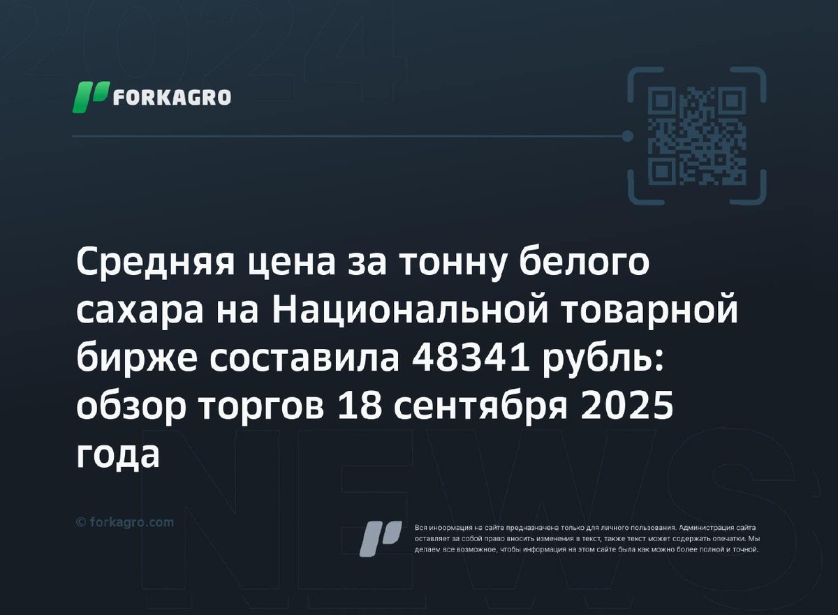 Средняя цена за тонну белого сахара на Национальной товарной бирже составила 48341 рубль: обзор торгов 18 сентября 2025 года