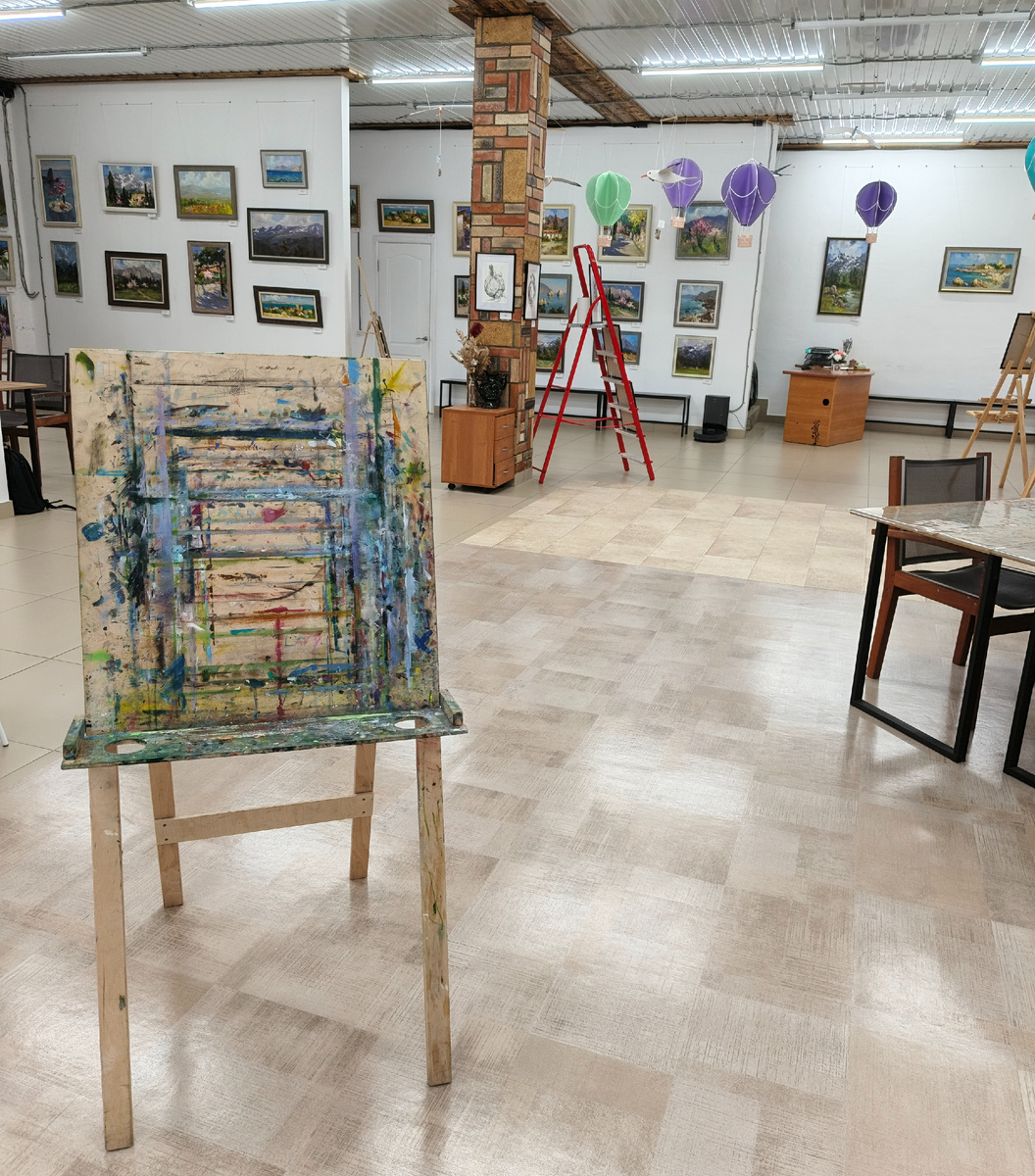 В один из ветреных и дождливых дней наших крымских каникул мы посетили независимый "Цех". Арт-пространство открылось в Феодосии меньше года назад. Крайне приветливые и доброжелательные сотрудники, уютная обстановка сразу создали соответствующее настроение. В этом арт-пространстве организаторы устраивают концерты, лекции. Также здесь проходят мастер-классы по рисунку для всех желающих, несмотря на возраст и навыки. Разноцветные модели воздушных шаров. Роскошные чайки под потолком! У входа охранник в фривольной южной шляпе. На столе маленькие подсолнухи! "Лавка рукотворных чудес" Милые флажки Рукодельные зверюшки Про эту картину нам рассказали, что она написана в особой технике, когда краска наносится тонкими слоями, постепенно, много раз. Эффект потрясающий! В зале была представлена выставка художницы из Гурзуфа Малилы Писаренко. Вот некоторые её работы: "Натюрморт на даче К. Коровина" "Домик Чехова" Также порадовали нас работы участников мастер-классов. Обратила на себя внимани
