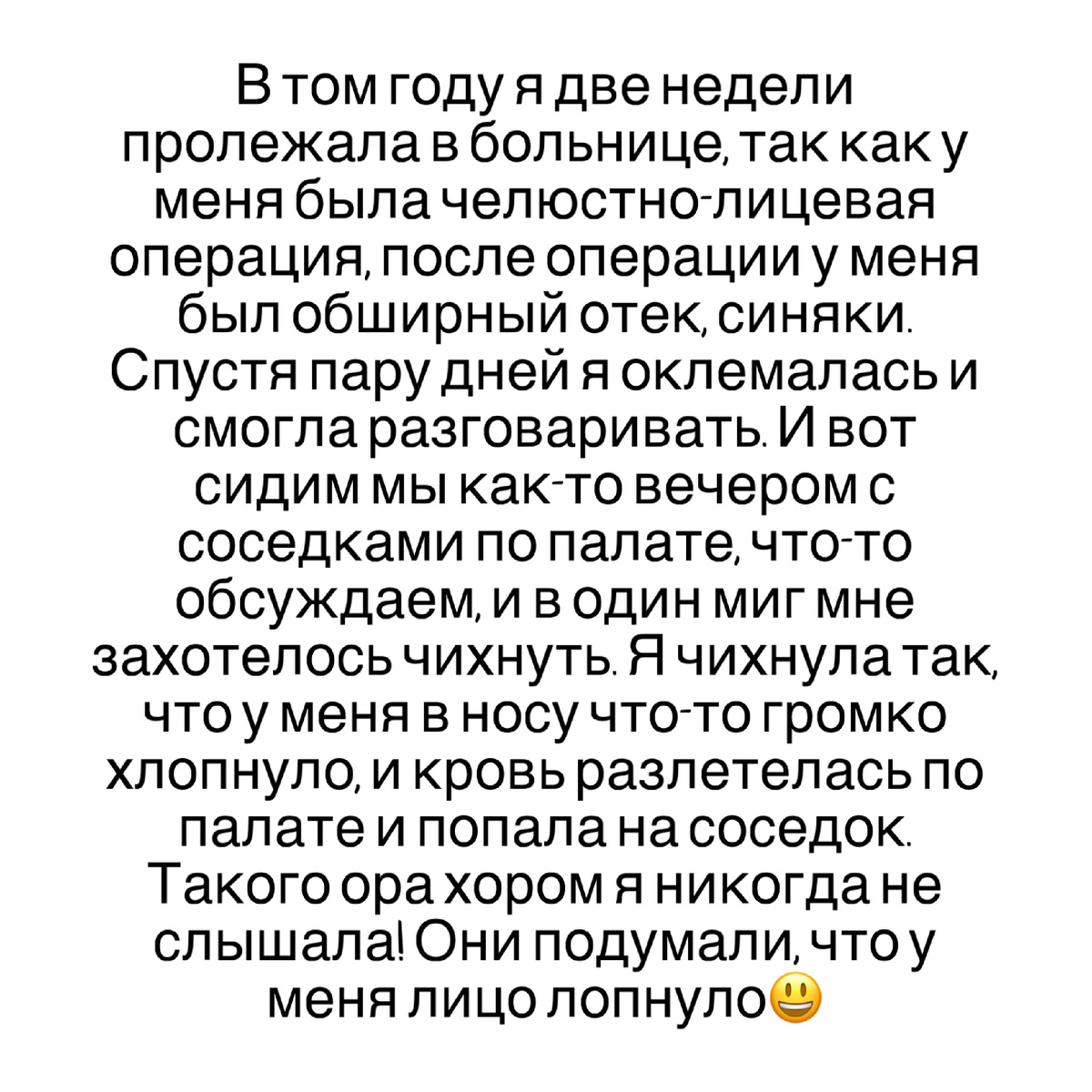 В том году я две недели пролежала в больнице, так как у меня была челюстно-лицевая операция, после операции у меня был обширный отек, синяки. Спустя пару дней я оклемалась и смогла разговаривать. И вот сидим мы как-то вечером с соседками по палате, что-то обсуждаем, и в один миг мне захотелось чихнуть. Я чихнула так, что у меня в носу что-то громко хлопнуло, и кровь разлетелась по палате и попала на соседок. Такого ора хором я никогда не слышала! Они подумали, что у меня лицо лопнуло😃