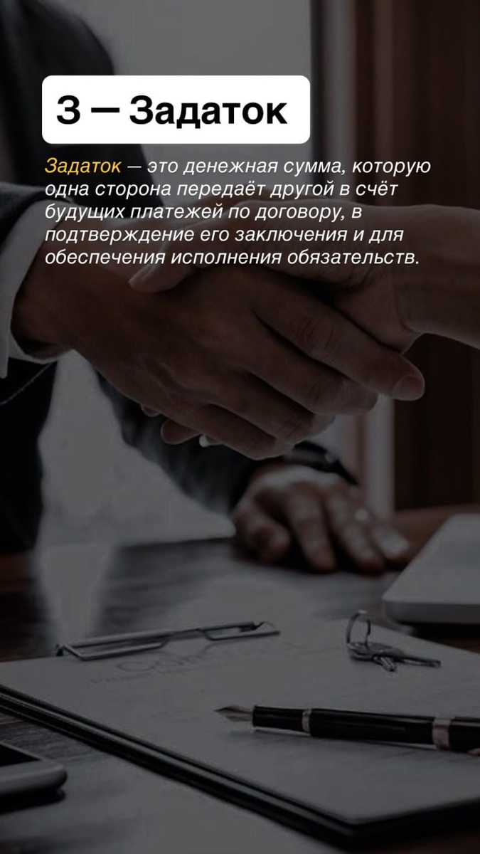 🗒 З — Задаток #юридическийсловарь Задаток — это денежная сумма, которую одна сторона передаёт другой в счёт будущих платежей по договору, в подтверждение его заключения и для обеспечения исполнения обязательств. 📄 Какие бывают? 🔸 Договорный задаток — прямо прописан в договоре и регулируется законом. 🔸 Фактический аванс (не задаток) — если в договоре не указано слово «задаток», деньги считаются авансом. 💼 Для чего нужен? 🔸 Подтверждает серьёзность намерений сторон. 🔸 Гарантирует, что сделка будет исполнена. 🔸 Защищает от недобросовестных действий при заключении договора. ⚖️ Особенности: 🔸 Если договор исполнен — задаток засчитывается в счёт платежей. 🔸 Если сторона, давшая задаток, уклоняется от исполнения — он остаётся у другой стороны. 🔸 Если нарушает сторона, получившая задаток — она обязана вернуть его в двойном размере. 🔎 Что будет, если договор не заключён? 🔸 Если сделка признана несостоявшейся — задаток возвращается. 🔸 Если договор недействителен — задаток подл