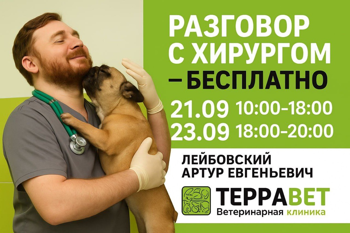 🔔 Новый формат в Терравет — «Разговор с хирургом» Хотите понять, нужна ли операция вашему питомцу? Или просто познакомиться с врачом, задать волнующие вопросы про хирургическое лечение? 21 сентября с 10:00 до 18:00 и 23 сентября с 18:00 до 20:00 вы можете записаться на бесплатный разговор с хирургом Лейбовским Артуром Евгеньевичем. ❗️Это не полноценный приём с осмотром и назначением лечения. Это именно беседа: о том, стоит ли делать операцию, какие бывают варианты, чего ожидать от хирургического вмешательства, или просто знакомство с врачом. 📍 Запись обязательна — количество мест ограничено. 📞 Звоните в клинику или пишите администратору, чтобы забронировать время. Это мы 👉 Терравет.рф АДРЕСА ФИЛИАЛОВ: Балашиха, пр. Ленина 32Б Балашиха, Советская, 42 ТЕЛЕФОН ДЛЯ ЗАПИСИ: + 7 495 155 37 53