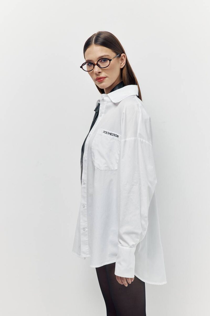 РУБАШКА POLYHEDRON "BE INSPIRED", BRIGHT WHITE COLOR Чистая форма, которая держит вертикаль и собирает образ без лишних деталей. В ней можно играть на контрасте с черным жакетом, создавать цельный монохром или подчеркивать акцентным низом. Она работает в строгой классике и в городских сетах — везде, где нужна ясность линии.