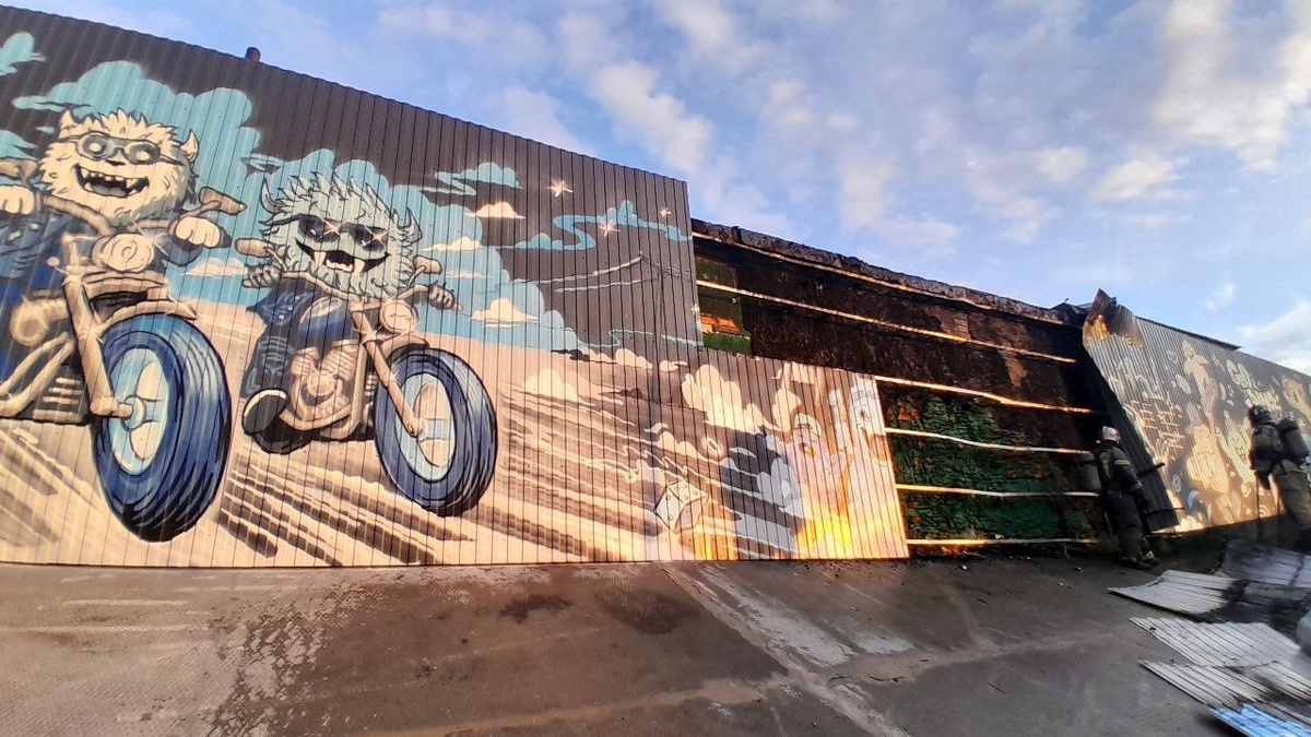 В Ноябрьском гаражном комплексе «Тепловик» произошло возгорание строительного мусора, которое повредило часть новой облицовки здания, украшенной граффити и включённой в проект будущего арт-объекта набережной озера Безымянное. Как сообщают представители МЧС ЯНАО, владельцы гаражей совместно со строителями оперативно справились с огнём до приезда профессиональных спасателей. Фото: Роман Лузанов