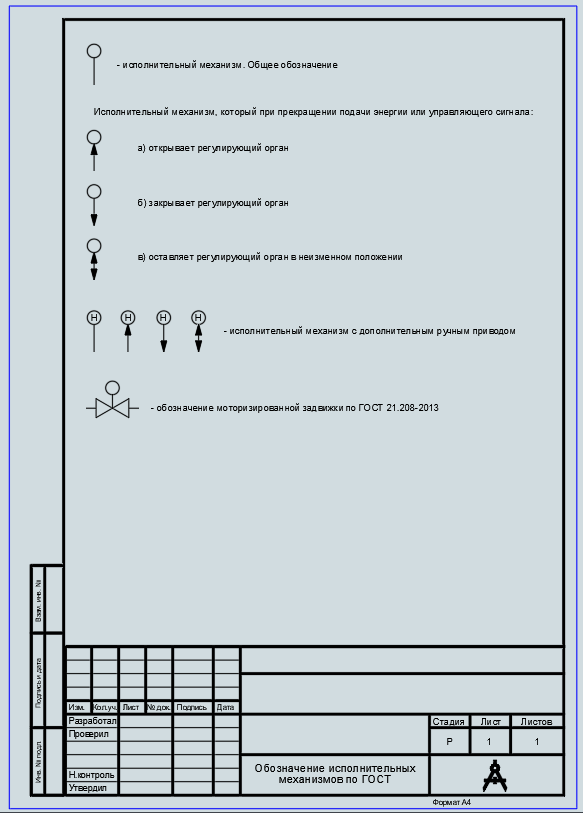 ГОСТ 21.208-2013 устанавливает условные обозначения исполнительных механизмов и других технических средств автоматизации в схемах и чертежах. Основные положения обозначения исполнительных механизмов: 1. Графическое обозначение. Исполнительные механизмы изображаются на схемах в виде условных графических символов. Они могут быть: o упрощёнными (для общих схем); o развёрнутыми (для детальных схем); o комбинированными (сочетание упрощённых и развёрнутых элементов). 2. Буквенные обозначения. Используются буквенные коды, которые указывают на: o вид измеряемой или регулируемой величины; o функциональный признак прибора; o позиционное обозначение на схеме. 3. Структура обозначения. Обычно обозначение состоит из нескольких частей: o первая буква — указывает на измеряемую или регулируемую величину (например, «Т» — температура, «Р» — давление, «L» — уровень и т. д.); o вторая и последующие буквы — уточняют функциональный признак (например, «I» — индикация, «С» — регулирование, «А» — сигнализация