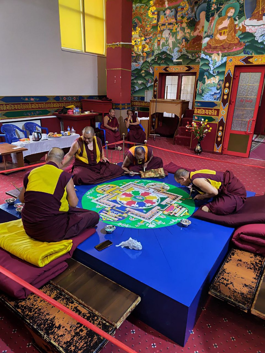 Песочную мандалу Бодхисаттвы Сострадания (Будды Безграничного Сострадания) Авалокитешвары (по-калмыцки Арьябала) возводят в Центральном Хуруле Калмыкии "Бурхн Багшин алтн сүм" ("Золотая обитель Будды Шакьямуни") монахи из тибетского монастыря Дрепунг Гоманг, расположенного в Индии. После завершения возведения мандалы, ее можно будет лицезреть до 14 октября.