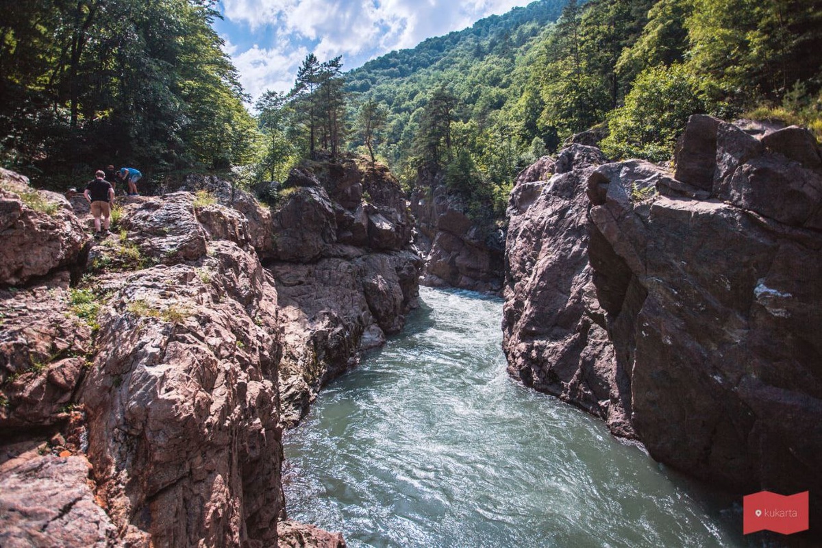 Гранитный каньон в Адыгее. Даховское гранитное ущелье, Каньон реки Белой и ущелье Блокгауз — как только не называют это место. Сюда приезжают для экстремального рафтинга и умиротворённого отдыха в тени деревьев. Над ним возвышается гора Трезубец, заметная издалека. Дорога к ущелью только одна, ошибиться почти невозможно. Она идёт в сторону посёлка Гузерипль.Протяжённость каньона примерно 4 км. Есть и другой каньон реки Белой — Хаджохская теснина. Их часто путают с Гранитным каньоном. Теснина находится в посёлке Каменномостский, он же Хаджох. Найти его можно рядом с тропой на плато Лаго-Наки. Как добраться Проще всего попасть в Гранитный каньон на машине. Для этого нужно выехать из Майкопа и передвигаться на юг в сторону станицы Даховской. Путь лежит по трассе Майкоп-Гузерипль. Минуя станицу Даховскую, нужно двигаться в сторон посёлка Гузерипль около 8 км. Ориентиром служит гора Трезубец, которую видно задолго до въезда в ущелье.