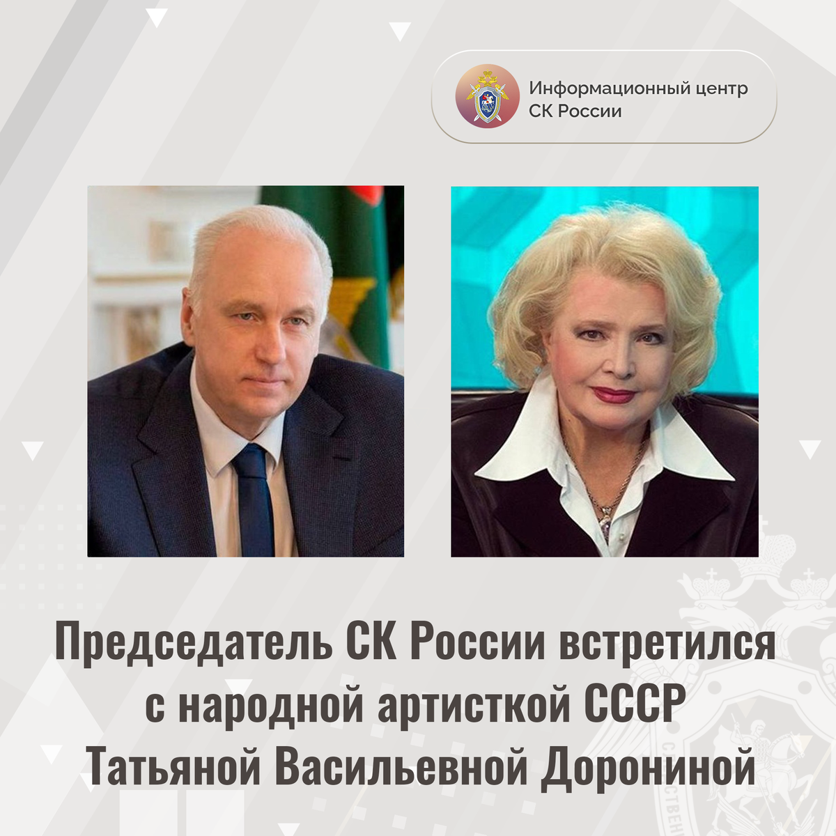 Председатель СК России встретился с народной артисткой СССР Татьяной Васильевной Дорониной Глава ведомства Александр Иванович Бастрыкин навестил народную артистку СССР, члена Общественного совета при Следственном комитете Российской Федерации Татьяну Васильевну Доронину. Председатель СК России поинтересовался состоянием здоровья Татьяны Васильевны, отметив её бодрость духа и неиссякаемый энтузиазм. В ходе беседы обсуждались вопросы нравственного и духовного воспитания подрастающего поколения. А.И. Бастрыкин поблагодарил Татьяну Васильевну за ее неравнодушие и ценный опыт, которым она делится с молодежью, являясь настоящим примером для подражания. Глава ведомства также выразил признательность за создание нравственно ориентированных образцов искусства, пропагандирующих идеалы добра и справедливости, и вручил народной артистке СССР Татьяне Дорониной медаль СК России «За чистоту помыслов и благородство дел». #СледственныйКомитет #СКРоссии #СКР #ИЦСКР #ИнформационныйЦентр