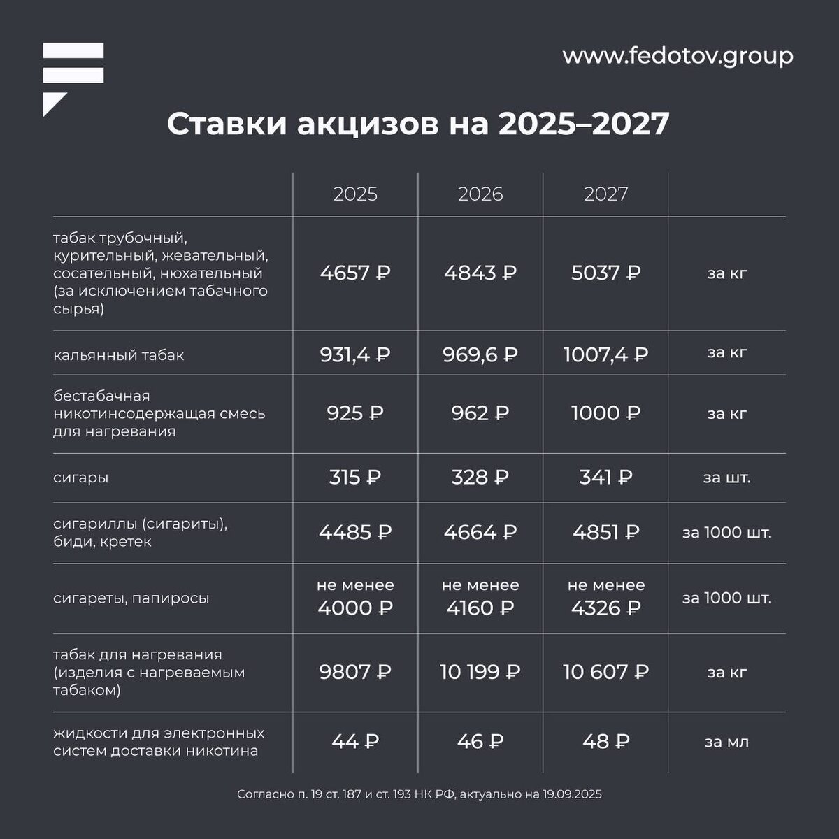 Ставки акцизов на все продукты 2025-2027 Собрали для вас актуальные ставки. Насчет ставок на сигареты — формула большая, в таблицы не вмещается, поэтому мы включили только минимальный порог. А кальянный табак уже с учетом уплаты акциза за массу табачного сырья 20%. Актуальные ставки акциза подробнее можно посмотреть в ст. 193 НК РФ. Актуально на 19.09.2025. Получить консультацию | Дать буст | Попасть в Retail Expert