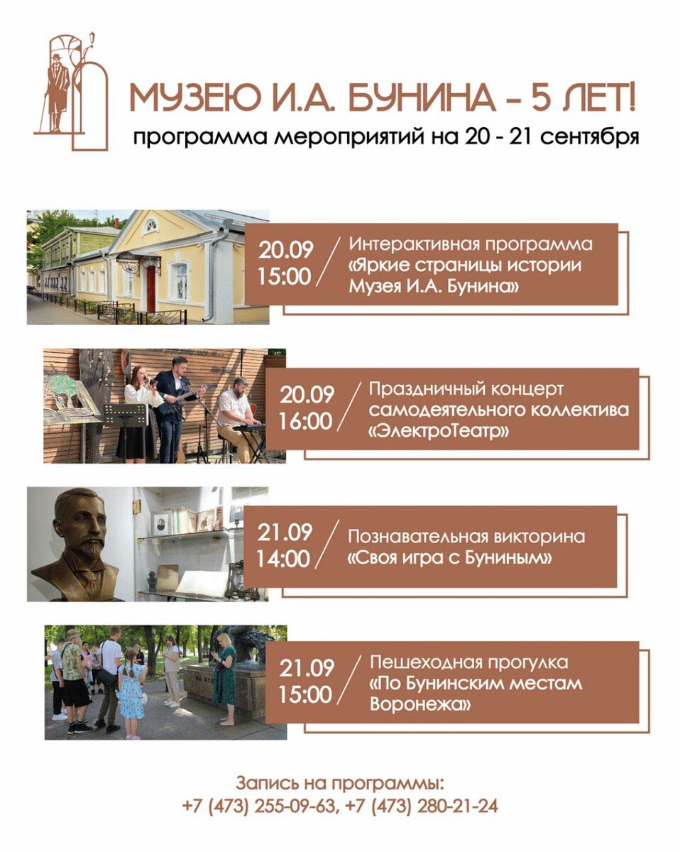 20 сентября Музей И.А. Бунина отмечает свой первый юбилей — пять лет со дня открытия! В преддверии этой даты музеем подготовлена насыщенная праздничная программа: концерты, викторины, прогулки и многое другое. 20 сентября – Празднование 5-летия музея И.А. Бунина 21 Сентября – Празднование 5-летия музея И.А. Бунина 27 Сентября Доступно по Пушкинской карте. Запись и справки по телефонам: +7 (473) 255-09-63, +7 (473) 280-21-24. Ведется предварительная запись на мероприятия! Наш Сайт