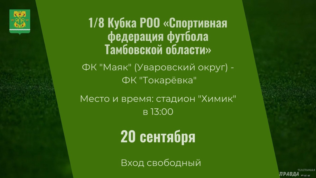 Центральное Черноземье Администрация Уваровского МО: ⚽Уважаемые любители футбола! Завтра, 20 сентября, на стадионе «Химик» в рамках 1/8 Пенальти.РФ Кубка РОО «Спортивная федерация футбола Тамбовской области» встретятся команды ФК «Маяк» (Уваровский округ) и ФК «Токарёвка». 🕐Начало матча в 13:00 👍Приходите поддержите спортсменов! Вход свободный. #УваровскийМО #футбол Подписывайтесь там, где читаете это! @УваровскийМО @PROновостиТамбовщины Телеграмная Правда @PROновостиЧерноземья Телеграмная Правда