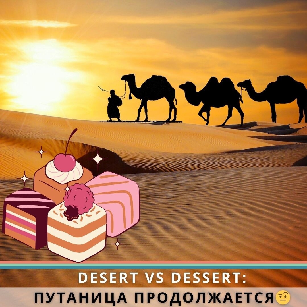 😅 Вы сидите вечером перед телевизором, рядом тарелочка аппетитных печенек и чашечка ароматного чая. Решаете заглянуть в словарь английского языка и вдруг видите два одинаковых слова: dessert и desert. Ой-ой, кажется, начинается приключение... Давайте разберёмся, что к чему! ✨ Dessert ❄️🍰 Это то самое вкусное завершение обеда, которое заставляет глаза светиться радостью. Торт, пирог, мороженое — короче, любые сладости, которые радуют сердце и желудок. Видели бы вы улыбку моей бабушки, когда ей приносят шоколадный мусс! 👋 🌵 Desert 🏜️ Совсем другое дело! Это суровая территория песка, жары и ветра. Без воды, без деревьев, без тортиков. Настоящая проверка на прочность! 😱 Практическое задание 👇🏻 Разберитесь в ситуации: 1. Папа купил книгу о путешествиях по песчаным просторам Африки. Там описаны приключения в ___________. 2. Мама спросила, хочешь ли ты кусочек вкусного яблочного пирога. Она назвала его домашним ____________. Поделитесь правильными ответами в комментариях! 💪 Весё