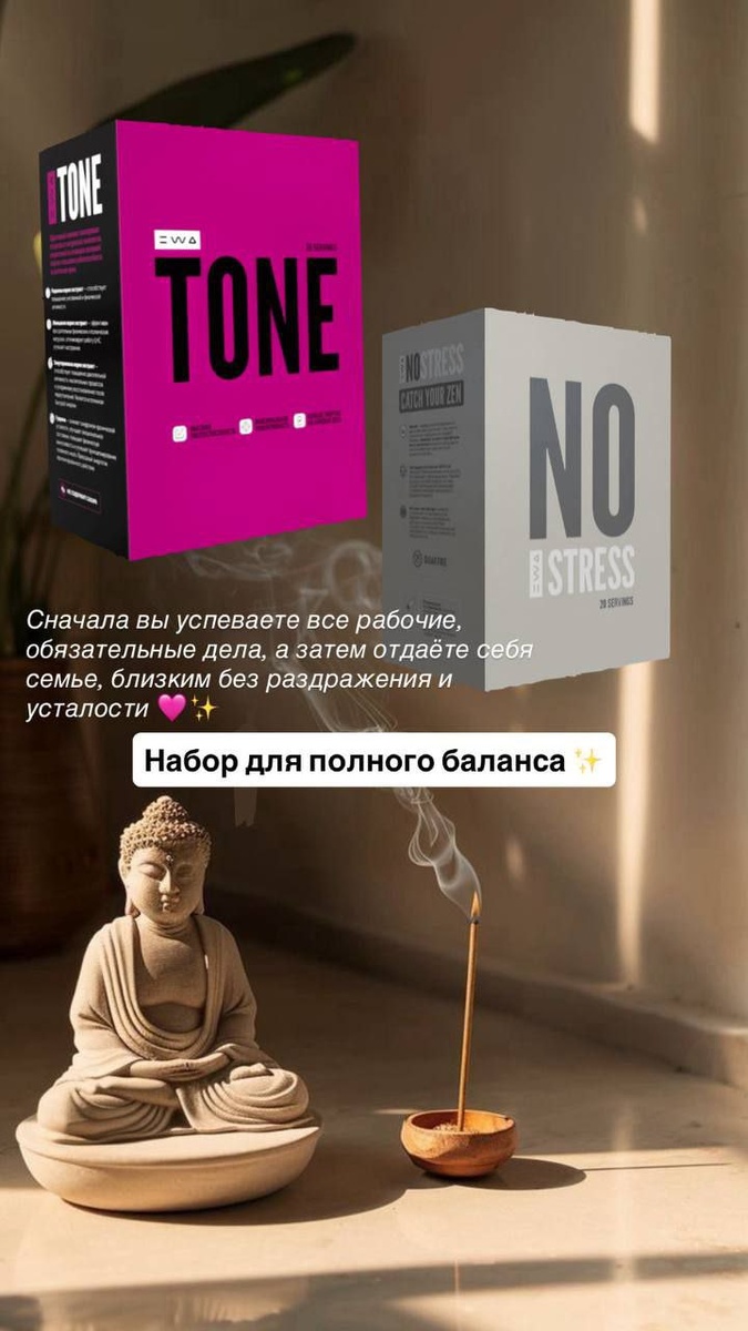 В чем логика пить вместе эти БАДы? Этот набор — must-have для тех, кто хочет жить на полную, но без вреда для здоровья! ✅ Для спортсменов: TONE — для энергии и выносливости на тренировке, NO STRESS — для быстрого восстановления мышц после. ✅ Для руководителей и предпринимателей: TONE — для ясности ума и принятия решений, NO STRESS — чтобы «выключить» мозг вечером и избежать выгорания. ✅ Для студентов: TONE — для концентрации во время сессии, NO STRESS — для борьбы с тревожностью и здорового сна. ✅ Для всех активных людей: Которые хотят успевать больше, но к вечеру оставаться в ресурсе для себя и семьи.