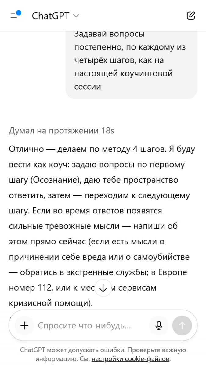 Избавляемся от ВЫГОРАНИЯ за один промт: ChatGPT станет вашим личным коучем, который поможет выйти из состояния стресса, поможет восстановиться и найти энергию двигаться дальше. Забираем промт: Я хочу избавиться от выгорания и снова почувствовать энергию и вдохновение в своей деятельности, используя глубокий коучинговый разбор. Пожалуйста, проведи для меня коучинговую сессию, используя метод 4 ключевых шагов: 1. Осознание — найди настоящие причины моего выгорания. 2. Отсечение — определи, от каких действий или задач мне срочно нужно отказаться. 3. Восстановление — задай вопросы, которые помогут мне понять, что именно поможет восстановить мою энергию и вдохновение. 4. Действие — помоги мне составить простой план действий на ближайшие 7 дней, чтобы быстро почувствовать облегчение и снова зарядиться энергией. Задавай вопросы постепенно, по каждому из четырёх шагов, как на настоящей коучинговой сессии Пользуйтесь!