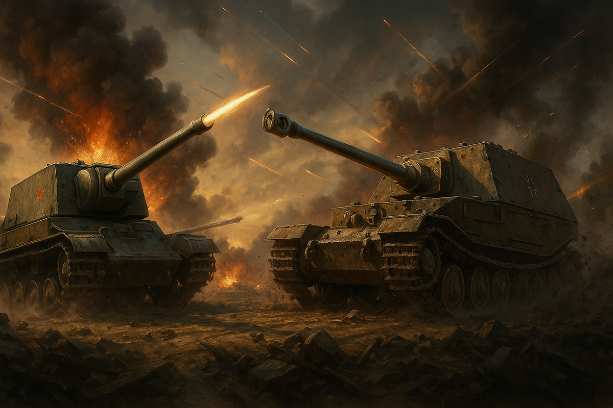 Две тяжёлые самоходки родились для разных задач, но встретились на одном поле боя — летом 1943-го. Советская СУ-152 прозвали «Зверобоем» за фугасную мощь, немецкий «Фердинанд» (позже — «Элефант») — «дальнобойным охотником» с 88-мм орудием. Давайте разложим, кто что умел на самом деле, где они сильны, где уязвимы и почему их часто сравнивают некорректно. Итог: машины разного класса. Сравнивать «в лоб» корректно только в тех эпизодах, где они вынужденно делали одинаковую работу — бились с бронетехникой. Вывод: на дальних рубежах преимущество у «Фердинанда». На средних/близких дистанциях, особенно по укрытым целям и в застроенной местности, козырь СУ-152 — фугасная мощь. СУ-152: лоб рубки противоснарядный, но немецкие 75/88-мм пробивали на средних дистанциях; спасали — грамотно выбранные позиции, маскировка, работа из засад. «Фердинанд»: толстенный лоб делал его крайне стойким «в лобовой перестрелке», но борта/корма, мины и ПТО ближнего боя — ахиллесова пята. Ранняя партия вообще шла без