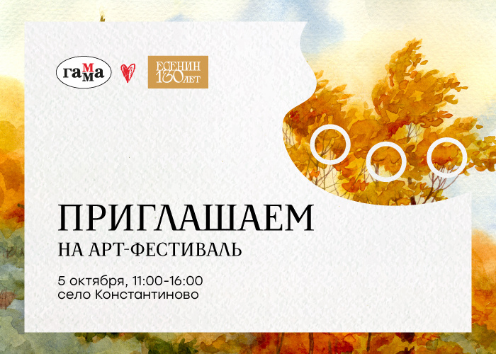 5 октября приглашаем вас на арт-фестиваль в село Константиново, где родился и вырос Сергей Александрович Есенин. В этом году отмечается 130 лет со дня рождения поэта, и мы вместе отпразднуем эту дату творчеством и вдохновением. Начало мероприятия в 11:00. Вас ждёт встреча с художницей из Петербурга Марией Павловой. В 2003 году она окончила Академию художеств. С 2005 года является членом Союза художников и Национального союза пастелистов, а в 2006 году ей была присуждена Государственная стипендия Министерства культуры РФ. Совместно с «ГАММОЙ» Мария создала авторский набор пастели, который представит и протестирует впервые именно на фестивале. Также художница проведёт демо, творческий мастер-класс и поделится секретами мастерства. Арт-фестиваль будет наполнен атмосферой семейного праздника. Дети смогут творить на специальных мастер-классах и повеселиться в игровых зонах. Всех гостей ждут яркие фотозоны, иммерсивные театральные постановки, выступления детских коллективов и много вкусносте