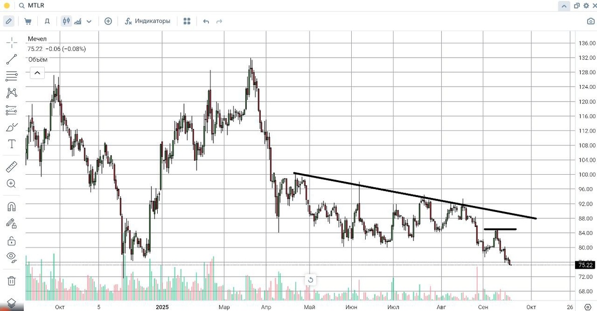 Акции Мечел ао. 19.09.25. Акции торгуются у уровня 75 рублей. Текущее положение вещей можно назвать как тест сверху вниз прошлогоднего уровня минимальных котировок. Ситуация выглядит, конечно же “медвежьей”. На сегодняшний день разворотных формаций “бычьего” характер не наблюдается. С технической точки зрения инструмент, по-прежнему, находится в рамках формирования локального понижательного движения, условная верхняя граница которого отображена на скрине и развивается с весны этого года от уровня 100 рублей за акцию. В качестве сопротивления, устойчивость которого играет на стороне “медведей”, остается уровень 85 рублей за акцию, у которого сформировался текущий максимум этого месяца. #MTLR #акции