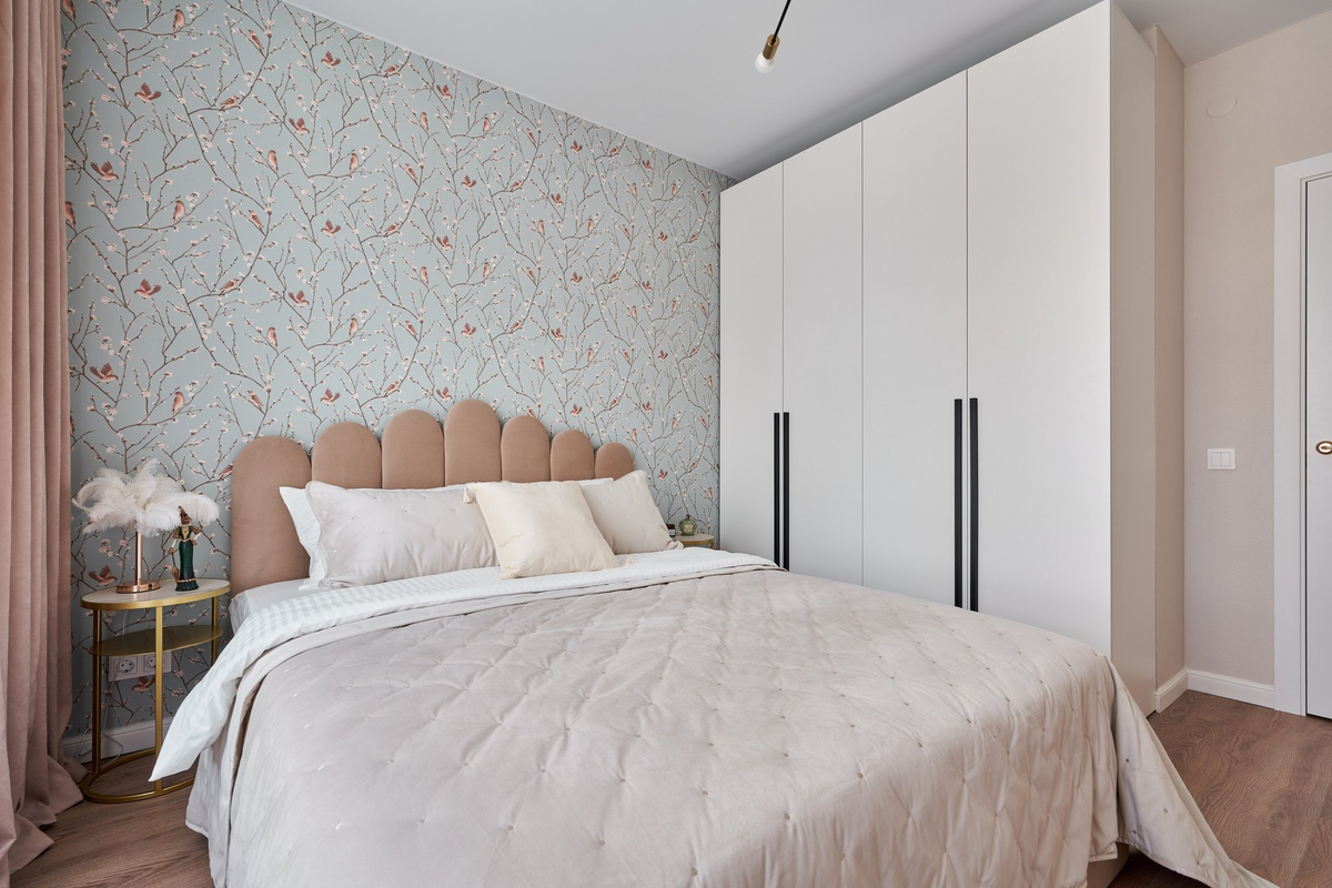 Чтобы несколько разнообразить однотонный стиль квартиры, для спальни подобрали пастельные обои с милым принтом. Рисунок с птицами на тонких ветвях на нежном голубом фоне смотрится одновременно стильно и необычно. Кроме того, на этом фоне особенно выгодно смотрится необычное изголовье кровати Лиель от divan.ru.