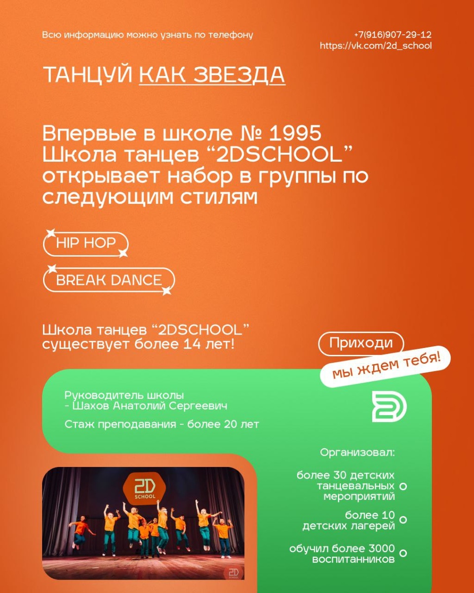 📢 Танцуй как звезда! В нашей школе №1995 стартует набор в группы танцевальной школы 2DSCHOOL 💃🕺 Впервые открывается набор в группы в самых дерзких стилях: Hip Hop и Break Dance. ✨ Школа работает уже более 14 лет ✨ Руководитель с опытом преподавания более 20 лет ✨ Более 3000 воспитанников, десятки мероприятий и лагерей Не упусти шанс – приходи и стань частью команды! 🔥 📞 Записаться можно по телефону: +7 (916) 907-29-12 🌐 Подробности: https://vk.com/2d_school #ДОНМ #ШколыКолледжиМосквы #школа1995