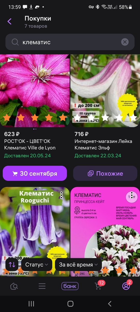 Добрый день, уважаемые мои читатели🤗. И так, как и обещала, продолжаю свой рассказ о моем опыте покупок на ВБ. Клематисы, я их купила аж 5 сортов и тут не все так радужно, есть откровенный обман. Сорта Роогучи и Эльф купила у продавца "Интернет -магазин Лейка", посадила весной 2024 года, в этом году уже обильно цвели красавцы и все по сорту все супер👍 нареканий нет👌 Клематис "Виль де Лион" продавец Росток-Цветок, тоже супер, зацвел по сорту. Цена у них всех была в диапазоне 600-700 рублей. Так хотелось мне клематис "Тайга", рискнула раскошелилась аж на 1125 рублей, заказала у продавца "Евро сад", получила корешек очень даже приличного качества, обрадовалась, высадила в горшок, проклюнулись почки, пошел росток, радости еще больше, но потом он стал гнать какие-то гигантские плети, стали терзать смутные сомнения, пошла в отзывы, и там все также как и у меня, какой-то дикий пересорт оказался,кто-то предположил, что это клематис винограднолистный, я его выкинула, также как и деньг