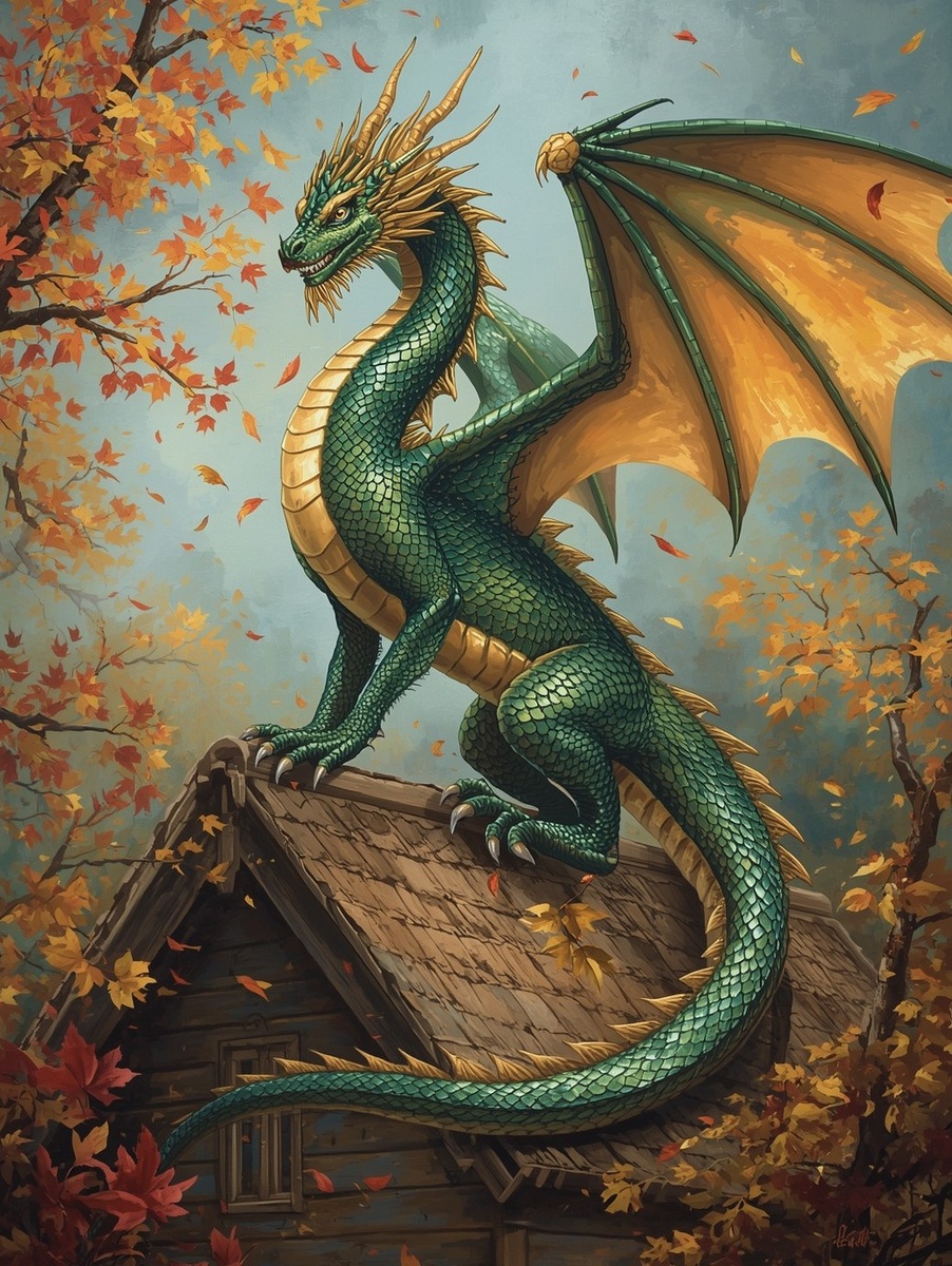 «Осенний повелитель». Промпт: Потрясающе красивый дракон с мерцающей золотисто-малахитовой чешуей, гордо стоящий на крыше причудливого дома посреди осенней листвы. Листья кружатся вокруг дракона, создавая ощущение движения и динамичности сцены. На этой картине дракон изображен в мельчайших деталях, каждая чешуйка завораживающе переливается на свету. Яркие и насыщенные цвета создают ощущение тепла и волшебства в этом захватывающем дух изображении. Нейросеть: Leonardo. Preset: Lucid Origin. #цифроваяживопись #нейроарт #fantasy #артыотнейросетей #нейросеть #дракон #DigitalDreamscapes #цифровоефото #арт #рисунок #нейрофото #digitalart #leonardo #aiartwork #иллюстрация #ai #артвподарок #бесплатныенейроарты #бесплатно #DIY #фентези #идеи
