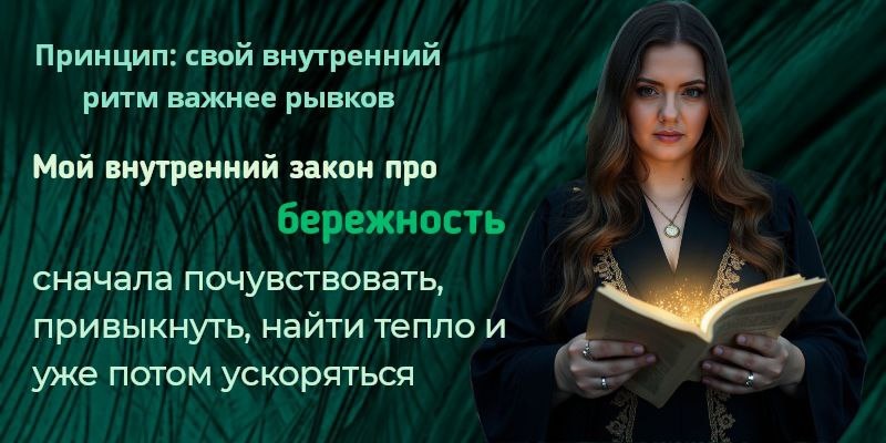 Плавное движение Принцип: свой ритм важнее рывков. Мой внутренний закон про бережность: сначала почувствовать, привыкнуть, найти тепло — и уже потом ускоряться. Как это выглядит в обычной жизни⬇️ ▪️Учёба. Заходит лучше, когда интересно и спокойно: понятный преподаватель, короткие шаги, без «догоняй любой ценой». ▪️Работа/дела. Нужны тёплая атмосфера, привычные ритуалы, паузы. Если всё холодно и «на нервах», желание быстро гаснет. ▪️Повседневность. Помогают маленькие привычки: утренний чай, музыка, прогулка. Через них тело «входит в поток». ▪️Отношения. Важна душевная связь. С «своими» людьми появляется лёгкость и сила, с «чужими» — зажим и усталость. Когда всё складывается 👍 Есть пространство для привыкания, рядом хотя бы один тёплый человек, и можно идти в своём темпе. Внутри спокойно, появляется желание делать, идеи приходят сами. Когда «мимо» 😢 Форсируешь события, живёшь по чужому графику, вокруг холодная команда или сухая коммуникация. Сигналы: зажатость, раздражение,