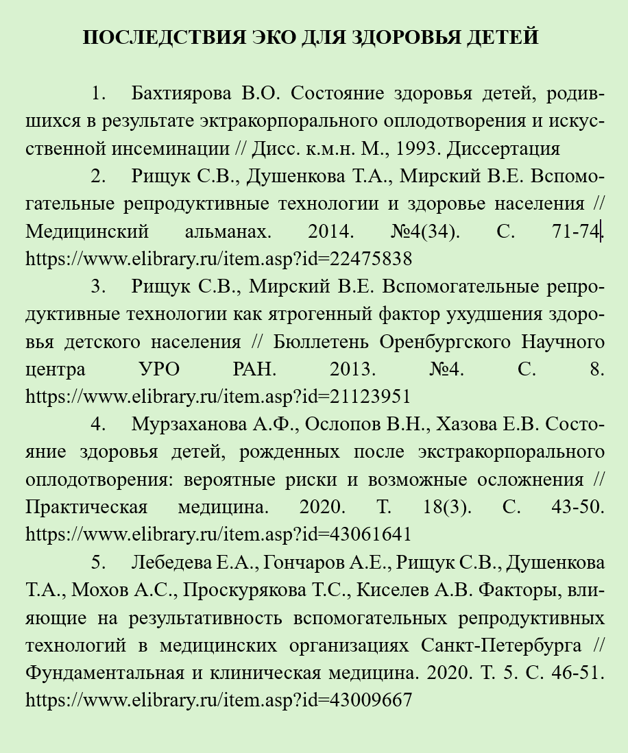 ПОСЛЕДСТВИЯ ЭКО ДЛЯ ЗДОРОВЬЯ ДЕТЕЙ: СПИСОК НАУЧНЫХ СТАТЕЙ ПО ТЕМЕ