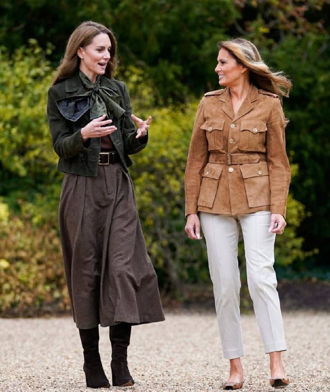 🇬🇧🇺🇸ВТОРОЙ ДЕНЬ ГОСУДАРСТВЕННОГО ВИЗИТА ПРЕЗИДЕНТА ТРАМПА В ЛОНДОН. Принцесса Уэльская и первая леди Мелания Трамп присоединились к группе молодых скаутов в садах Виндзора. В этот раз их стиль совершенно контрастировал по сравнению с предыдущим днем. На Кейт: 🔹Укороченная замшевая куртка в стиле милитари от ME+EM 🔹Шарф Sudbury Silkmills Shop 🔹Твидовая юбка Evilyn Birdseye темно-коричневого цвета от Ralph Lauren 🔹Серьга-подвеска с гранатом в форме капли Spells of Love Jewellery 🔹обувь Gianvito Rossi Ранее, королева Камилла и первая леди, посетили Королевскую библиотеку, и познакомились Королевской коллекцией литературы. Также они встретились со школьниками, которые показали им собственные книги с иллюстрациями. На Мелании строгий карамельно-коричневый кожаный костюм с юбкой, и вышитыми цветочными лацканами