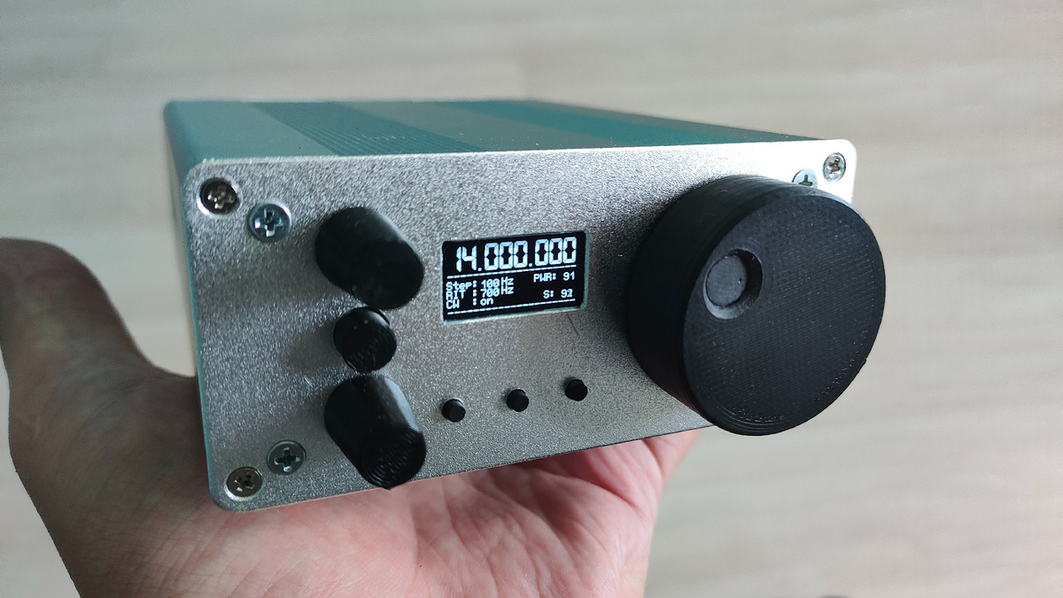 Слева вверху - регулятор расстройки частоты RIT. В середине - кнопка телеграфного фильтра. Снизу - регулятор громкости. Под дисплеем - три кнопки управления. По умолчанию, левая запускает маяк, а две остальных - регулировка шага настройки. Ну а справа, самая большая, естественно - ручка настройки.