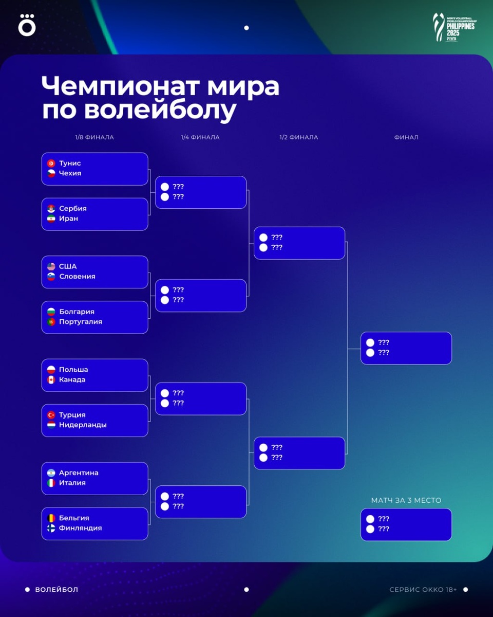 Лови сетку плей-офф мужского ЧМ по волейболу — уже завтра на Филиппинах начнутся матчи 1/8 финала 🏐 Смотри весь турнир в Okko: https://okko.tv/s/ths